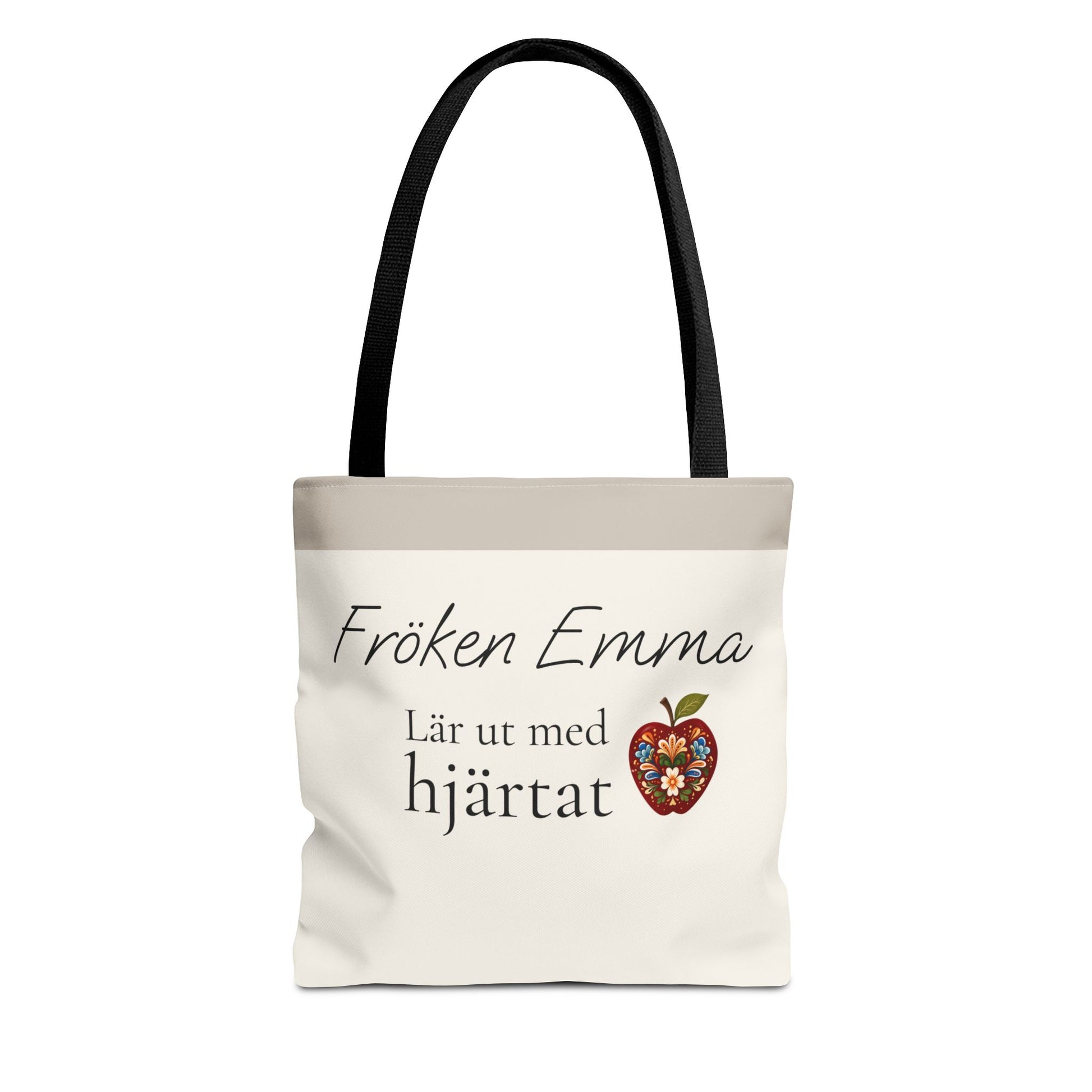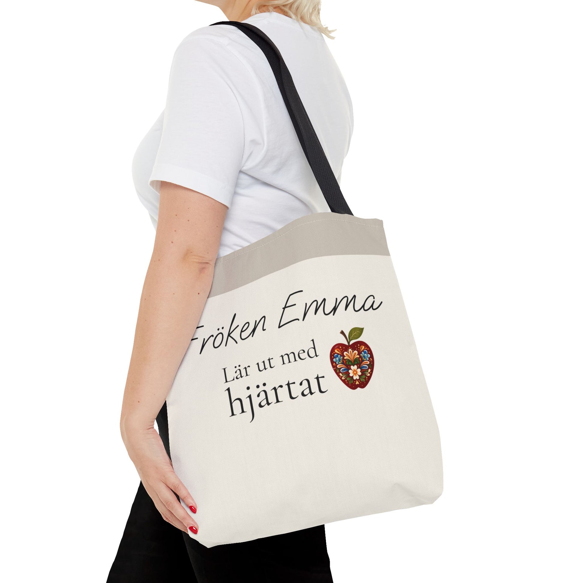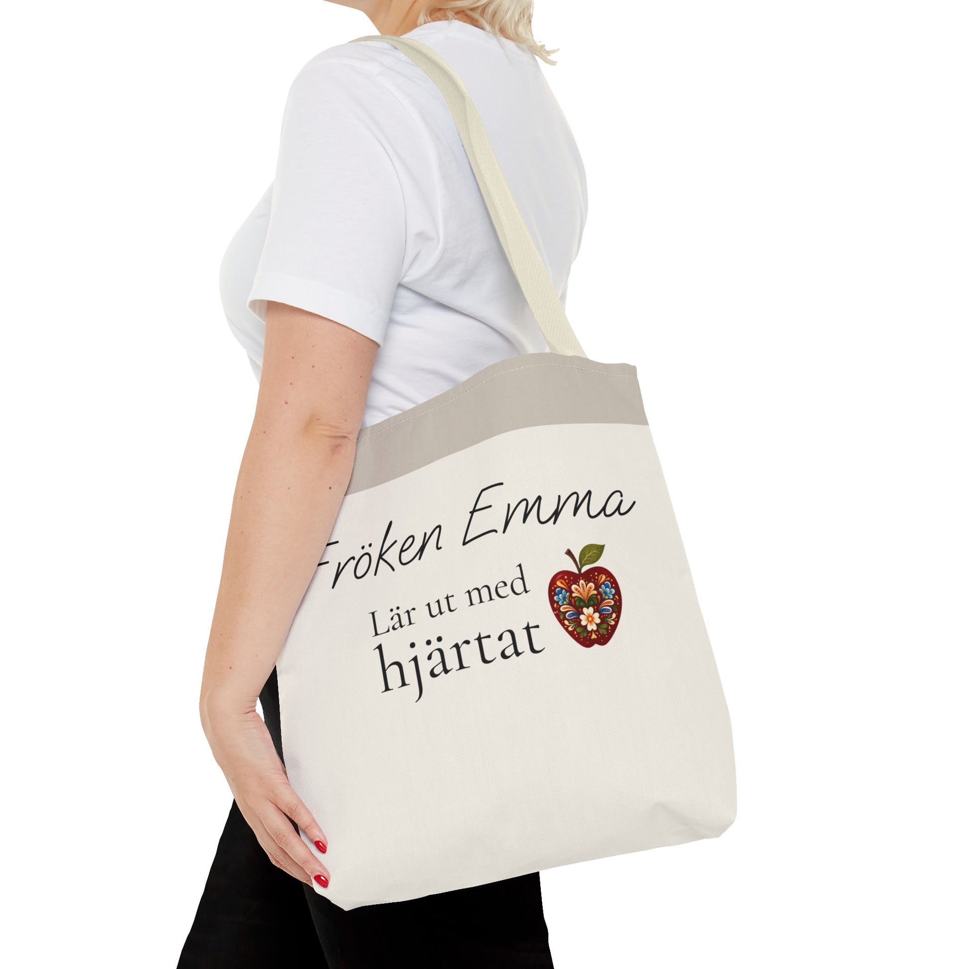 Den här totebagen med texten “Lär ut med hjärtat” och namn är en meningsfull present som visar uppskattning.
