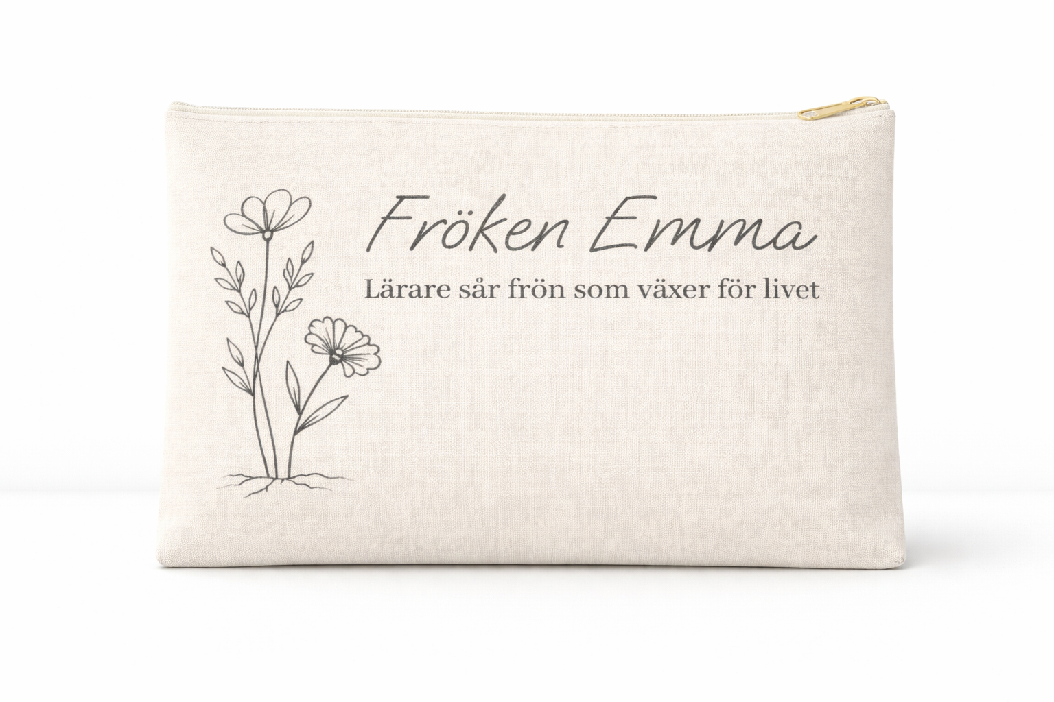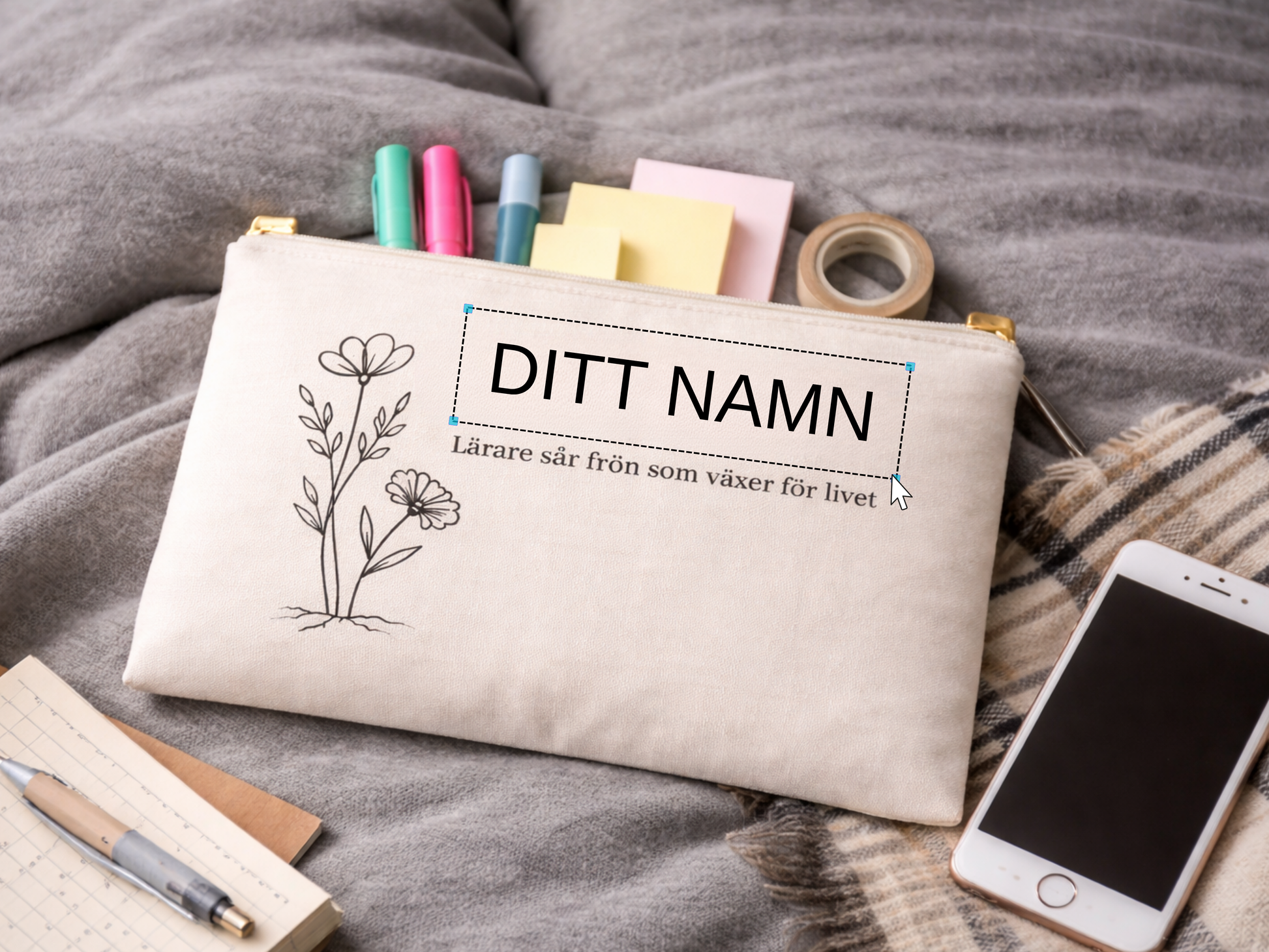 Skapa ett unikt pennskrin genom att skriva in ett namn eller en egen text, perfekt som present till lärare och pedagoger.
